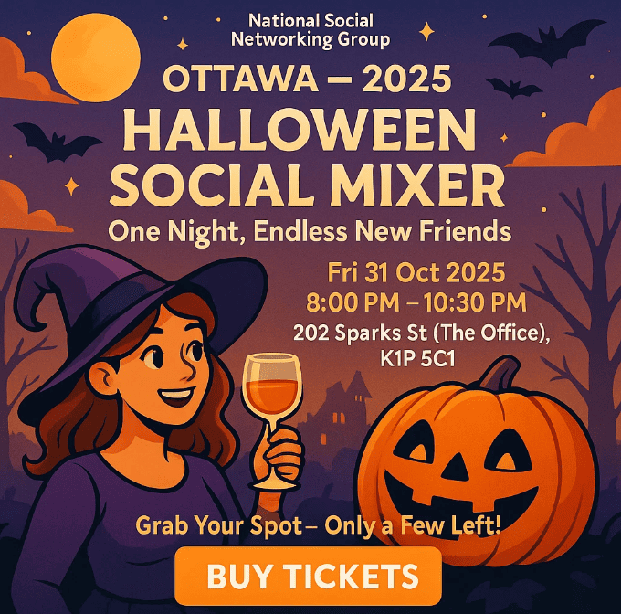 Looking for the best Halloween party in Ottawa? 🎃 Join us for a one-night-only Halloween Social Mixer on Friday, October 31, 2025 (8–10:30 PM) at The Office, 202 Sparks St. Dress up, sip festive cocktails, and meet 30+ fun locals in their 20s & 30s in a welcoming, zero-pressure atmosphere. Whether you’re new to the … Read more