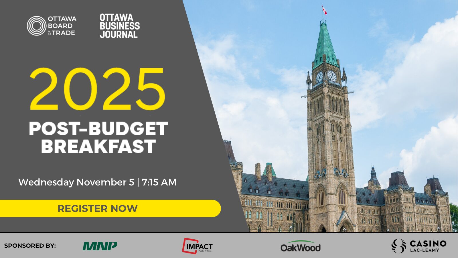 Held the morning after the release of the Federal Budget, join the Ottawa Board of Trade and Ottawa Business Journal for a detailed analysis of the highly anticipated budget. Hear critical insights into the federal government’s spending priorities and what they mean for businesses. Connect with business and community leaders and be informed on the … Read more